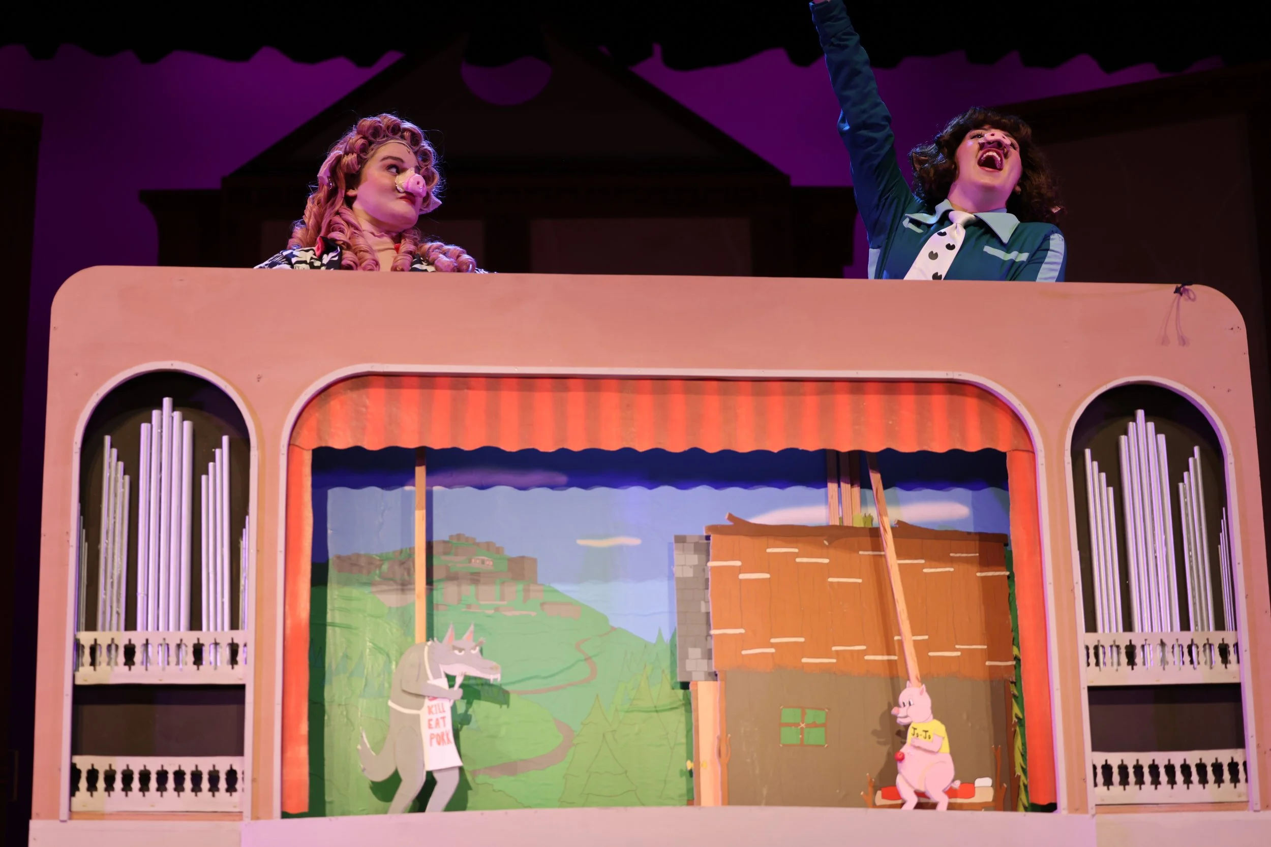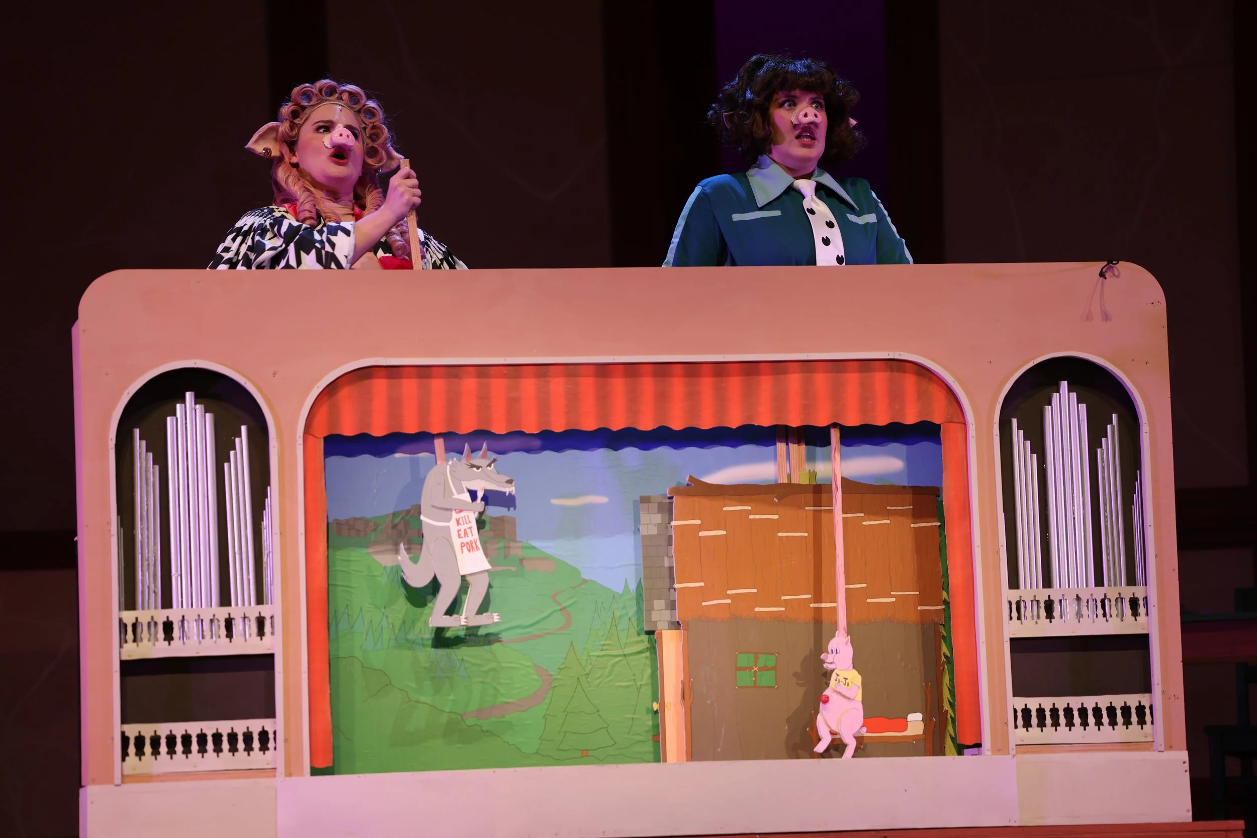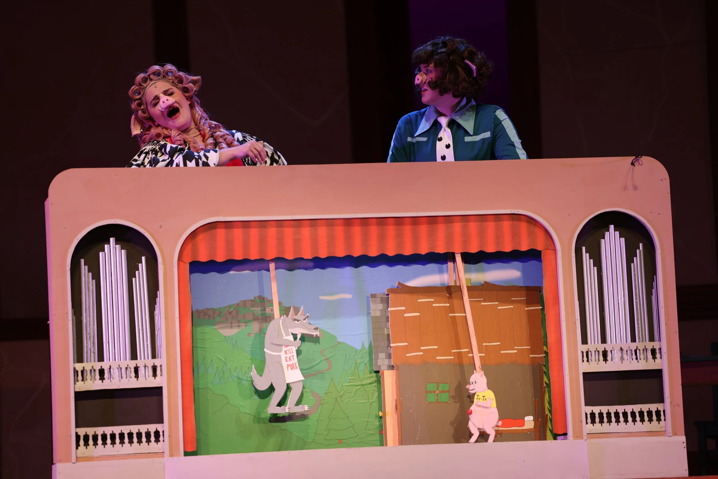 Shown is a puppet stage used for Gainesville Theatre Alliance’s 2024 production of The True Story of the 3 Little Pigs! The stage was designed by David Becker and built by student carpenters, while the background and puppets were designed and built by me. The puppets and prop houses were drawn as pencil drawings initially, then scanned into Photoshop to digitize and color. The background and curtains were drawn digitally directly in Photoshop. Both of which were scaled to the appropriate size and then printed on a large format printer.